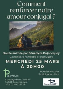 Cette soirée sera animée par Bénédicte Dujoncquoy, conseillère familiale et conjugale. A destination des couples.