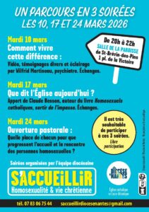 * Mardi 17 mars : Que dit l’Église aujourd’hui ? Qu’essaie-t-elle de mettre en œuvre ? avec un apport de Claude Besson, auteur du livre ‘Homosexuels catholiques, sortir de l’impasse’. Échanges.