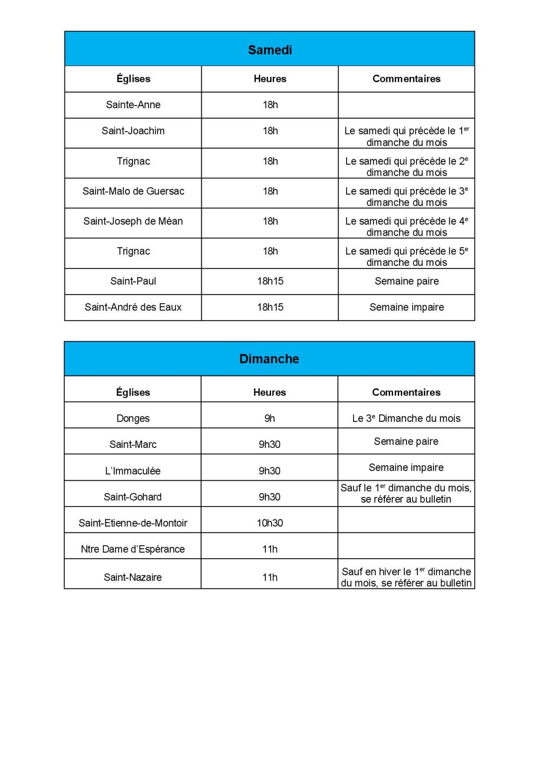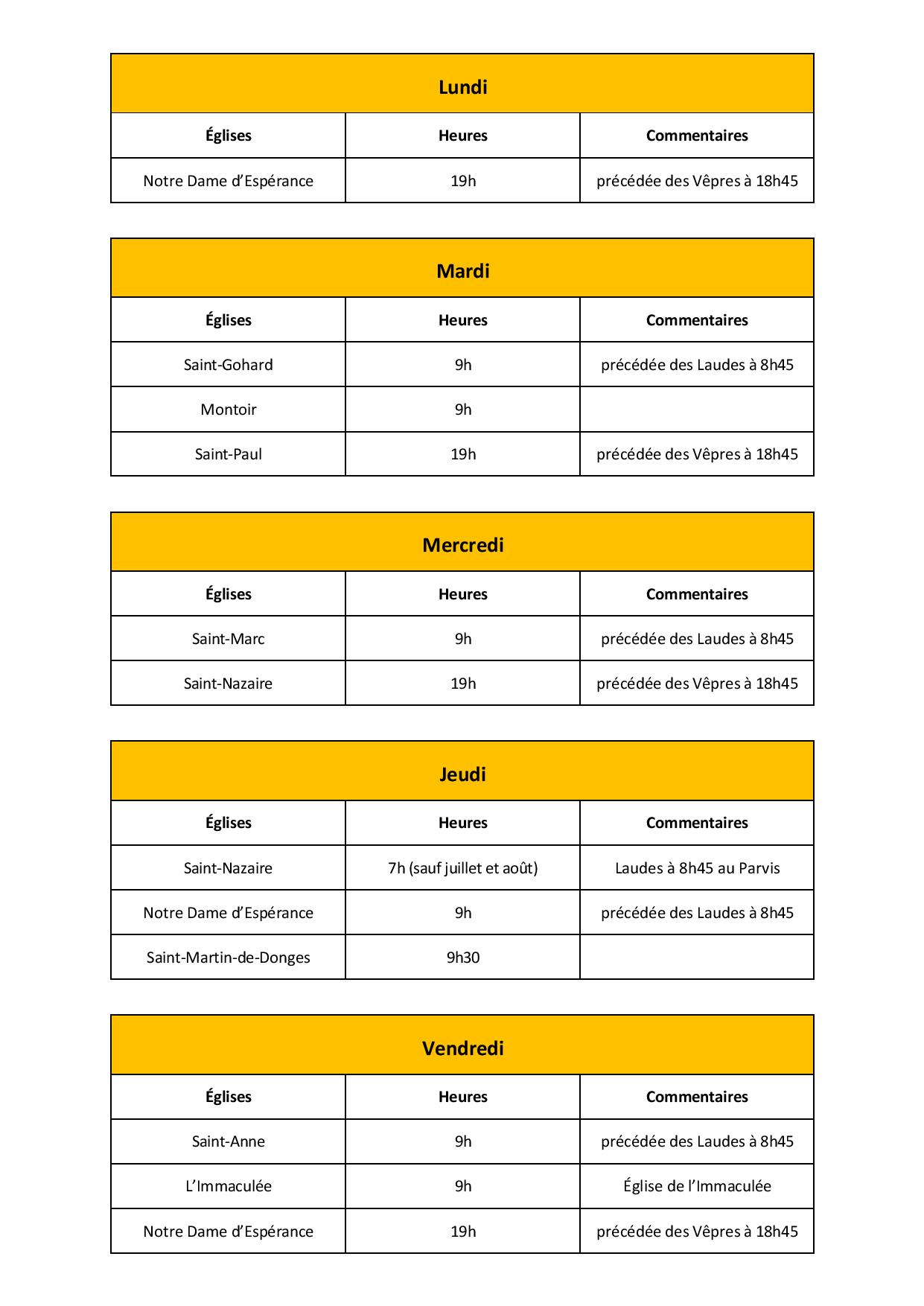 Attention aux mois de juillet et août : les prêtres sont aussi en vacances et certains horaires réduits ou adaptés.