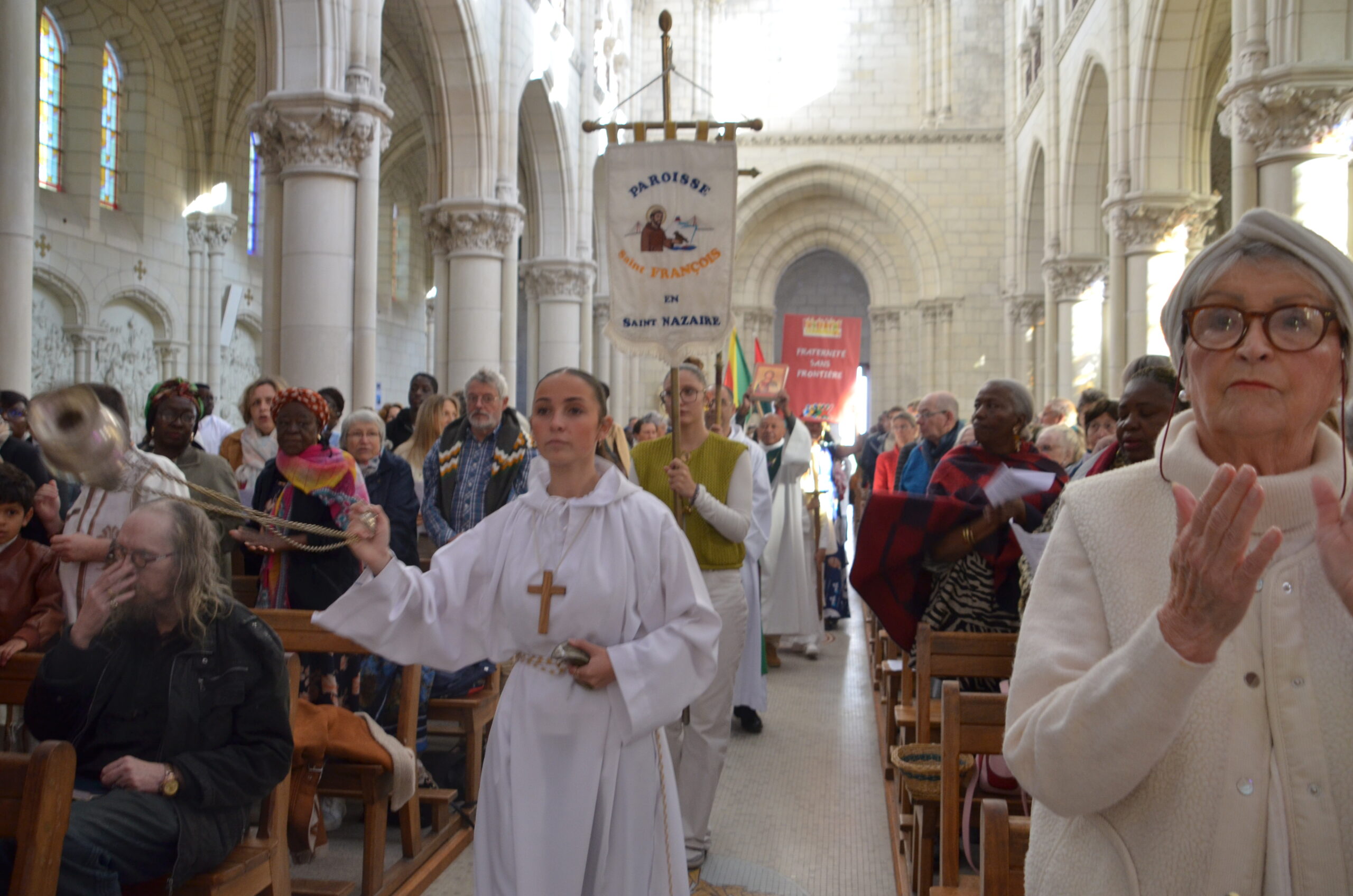 Festi Frat a commencé par une messe en l’église de St Nazaire, en présence de communautés d’origines étrangères venant de différents endroits du diocèse et des membres de la paroisse accueillante. Notre évêque Mgr Percerou a présidé, il était accompagné de Mgr N’Koué, évêque de Parakou au Bénin (diocèse jumelé) qui était venu assisté à la réouverture de la Cathédrale de Nantes le week-end précédent. Les chants en anglais, espagnol, portugais, italien, sango, manjak, syriaque, malgache … étaient animés par une chorale éphémère internationale. C’était si beau que l’assemblée a commencé à applaudir, oups. Chaque communauté a pu apporter des éléments qui représentent son pays lors de la procession d’entrée et de la procession des offrandes.